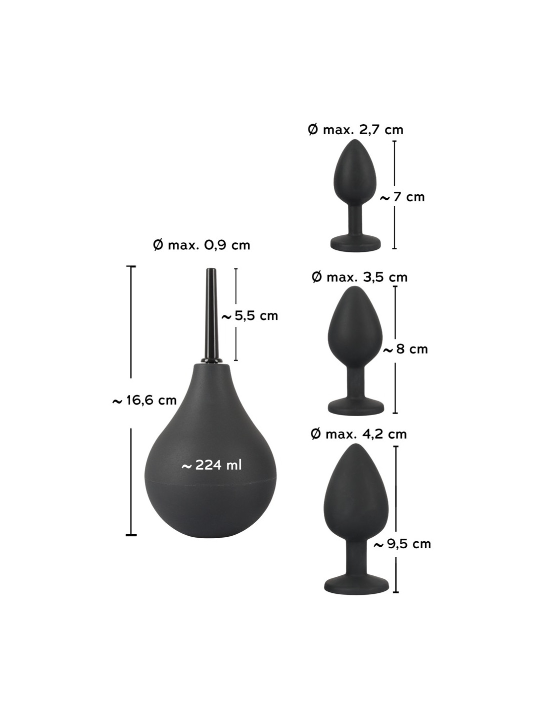 1 x analbruser til forberedende rensning og dejlige sprøjtefornemmelser. 16,6 cm lang, indsættelses længde 5,5 cm, dysediameter 0,7 til 0,9 cm, kapacitet 224 ml.