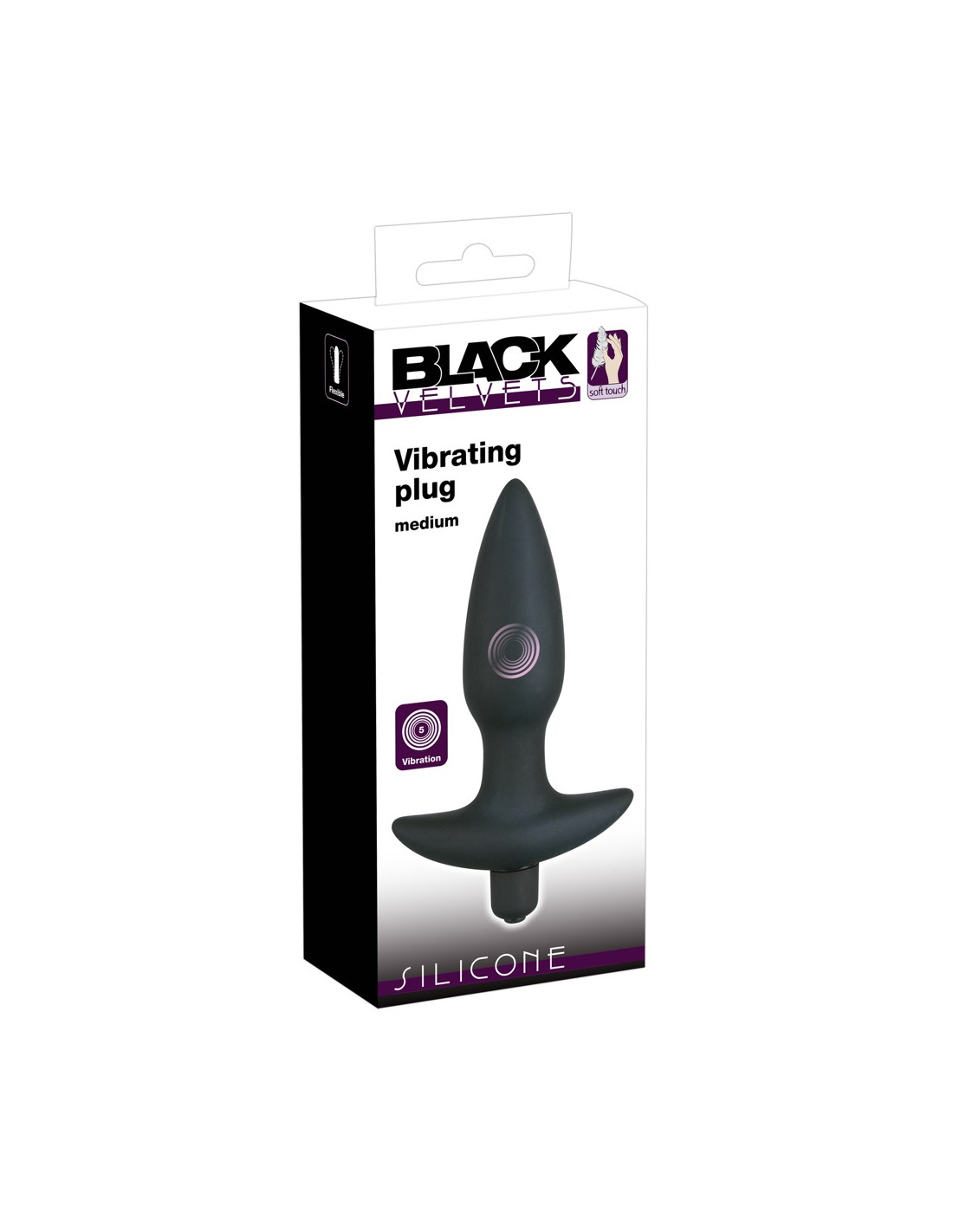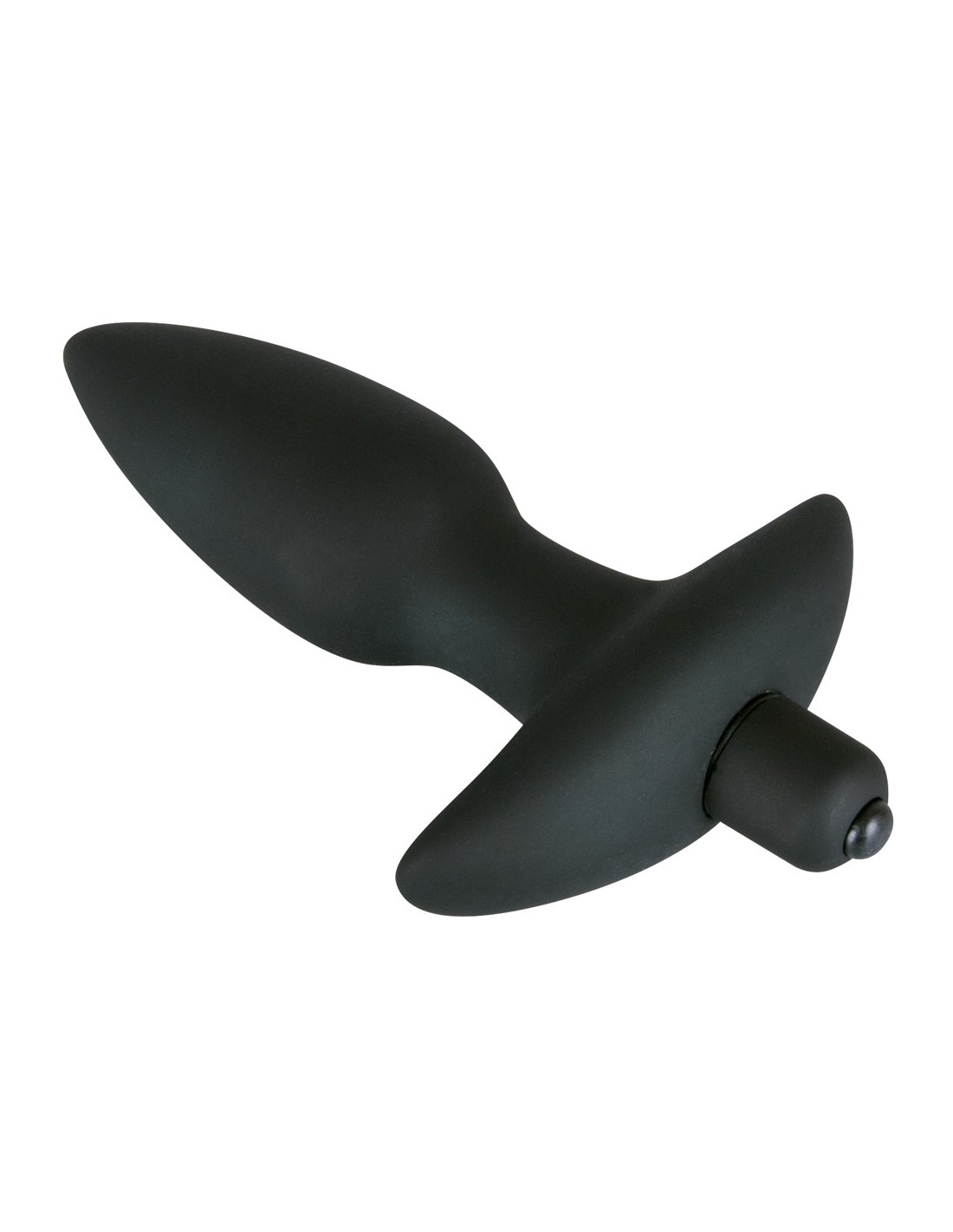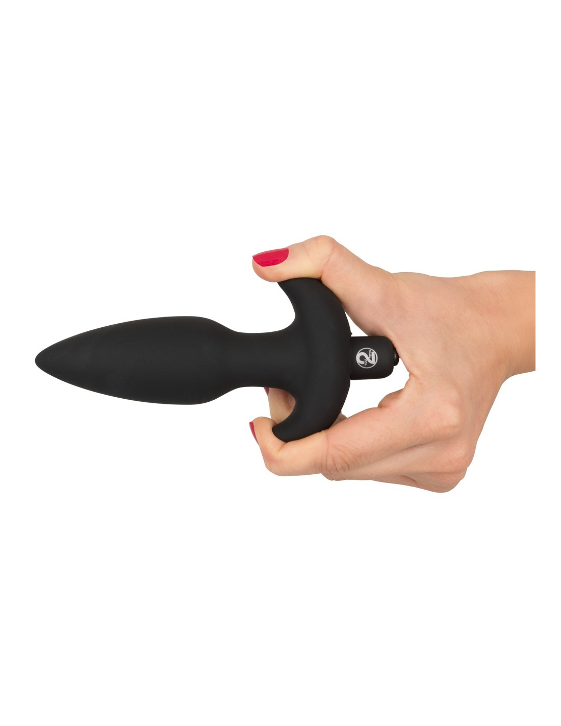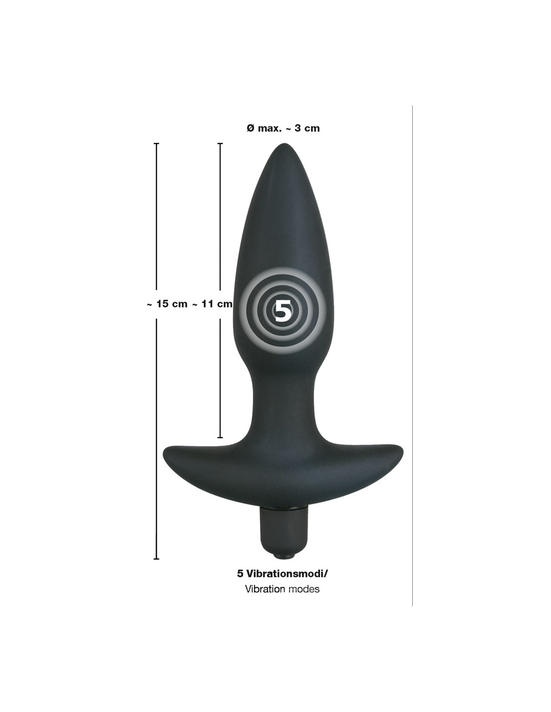 Sort analprop med 5 vibrationsindstillinger ved et tryk på en knap. Med udtagsgreb. Samlet længde ca. 15 cm, indsætningsdybde 11 cm. Diameter 2 cm til 3 cm. Materiale: silikone. (Batteri medfølger ikke: 1 x AAA).