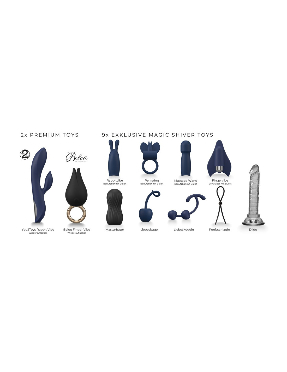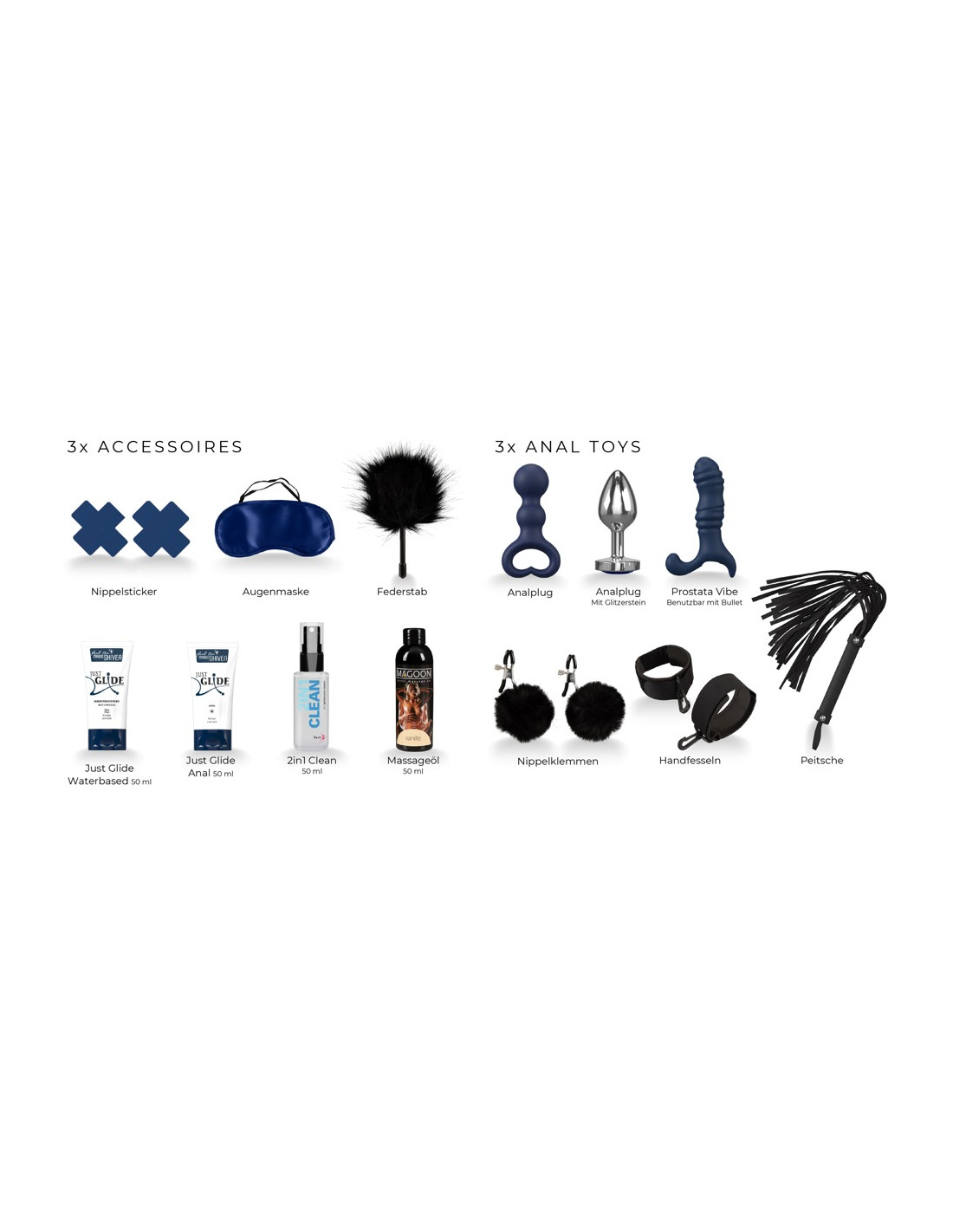 Inkluderet er: 2 x premium legetøj, 9 x legetøj, 3 x anal legetøj, 3 x tilbehør, 4 x væsker, 3 x blød bondage.